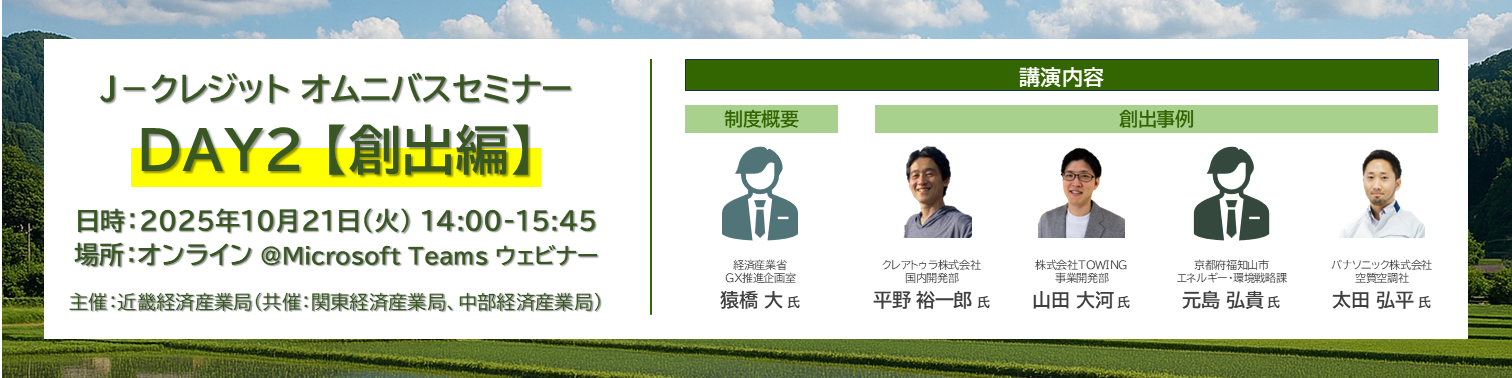 今年度、地域創生Coデザイン研究所(代表取締役所長 木上 秀則/以下、地域創生Coデザイン研究所)では、近畿経済産業局による「令和7年度 国内における温室効果ガス排出削減・吸収量認証制度の実施委託事業(近畿経済産業局J-クレジット制度推進のための地域支援事業)」を受託しており、本事業の一環として「関東経産局×中部経産局×近畿経産局 J-クレジットオムニバスセミナー」のDAY2【創出編】を企画・運営します。
