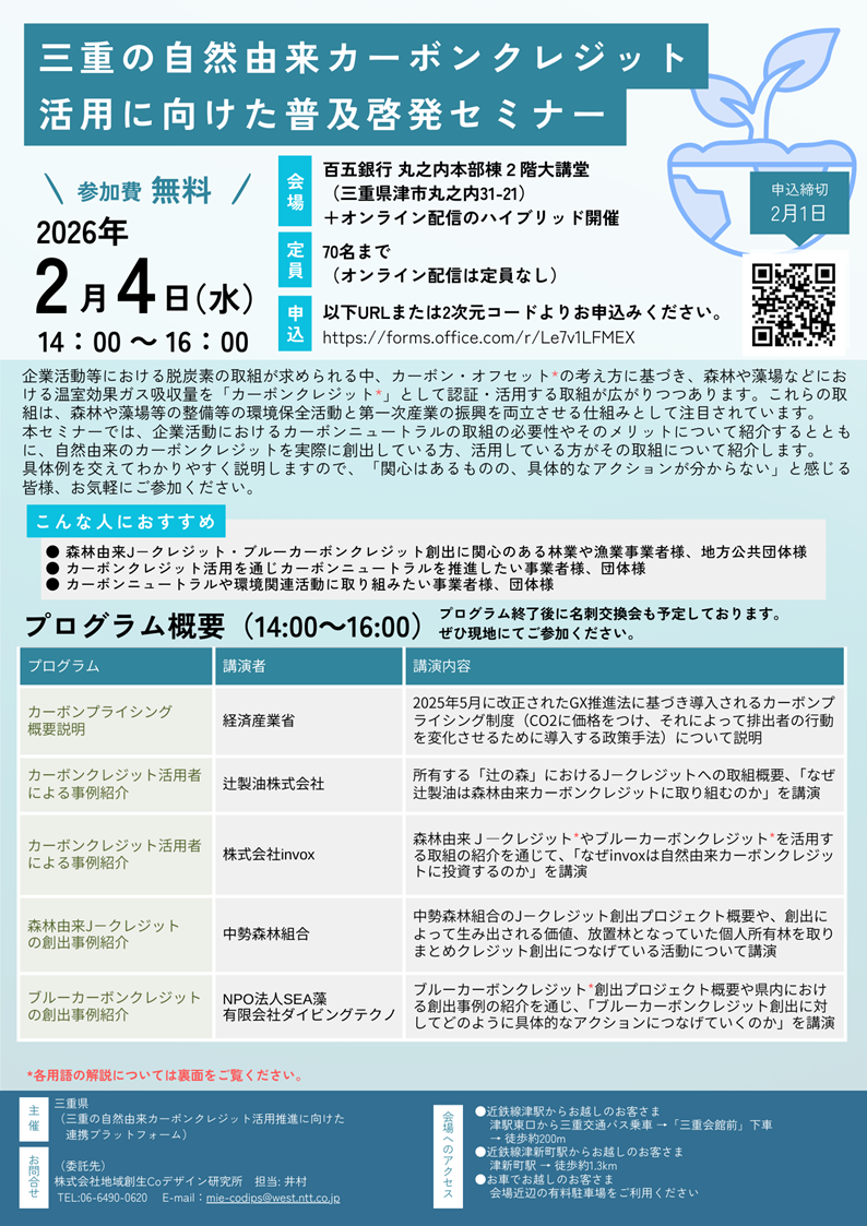 株式会社地域創生Coデザイン研究所(代表取締役所長 木上 秀則/以下、地域創生Coデザイン研究所)は、三重県による「三重の自然由来カーボンクレジット活用推進に向けた普及啓発業務」の委託先として、森林由来のJ-クレジット、ブルーカーボンクレジット等の自然由来カーボンクレジット活用拡大に向けた普及啓発セミナーを企画・運営します。